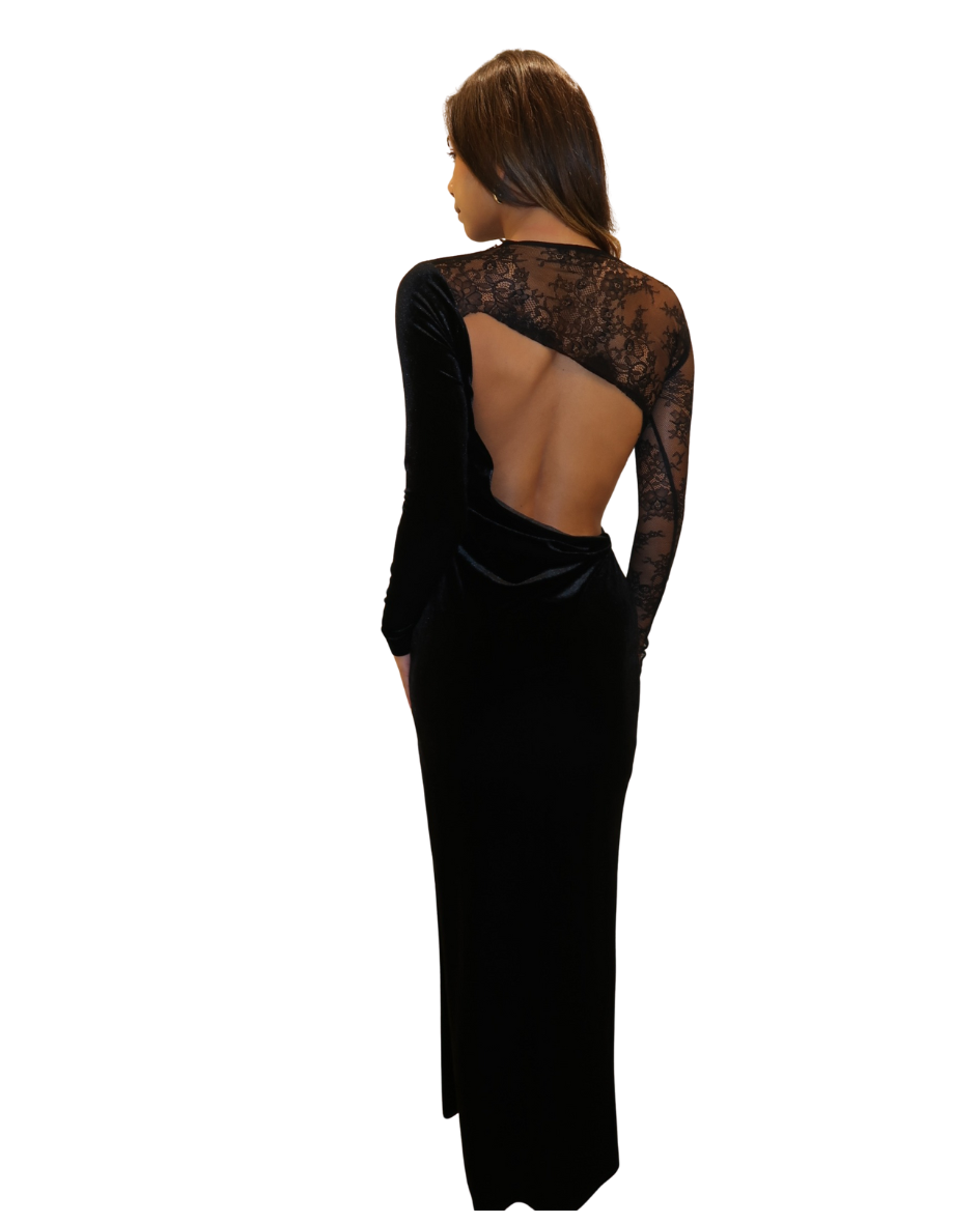 This black velvet lace maxi dress blends romance with modern allure, featuring rich velvet fabric accented by delicate lace panelling for striking contrast.