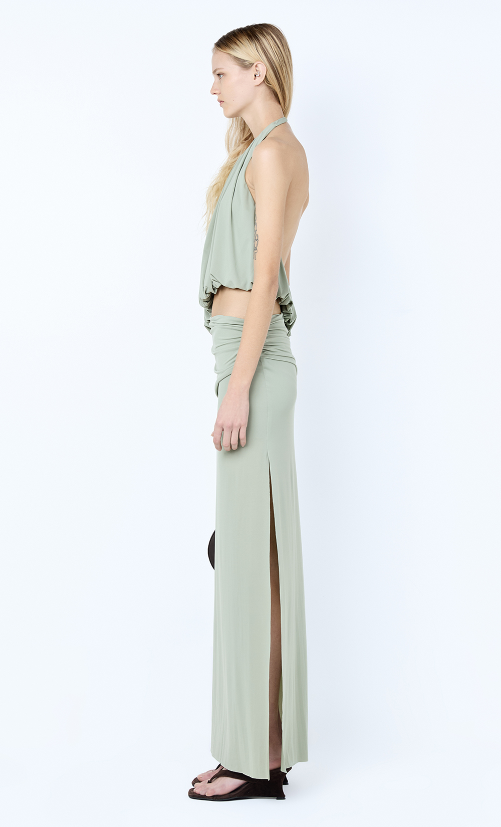 The Cadence Racer Maxi Dress in Pistachio is a sleek, event-ready style crafted from stretch jersey for a sculpted fit.