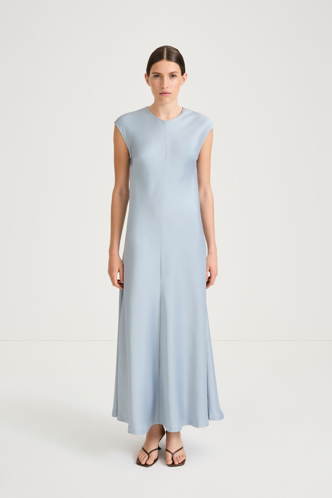 A softly defined empire waist flows into a sweeping skirt with a subtle slit, creating effortless movement and refined allure.
