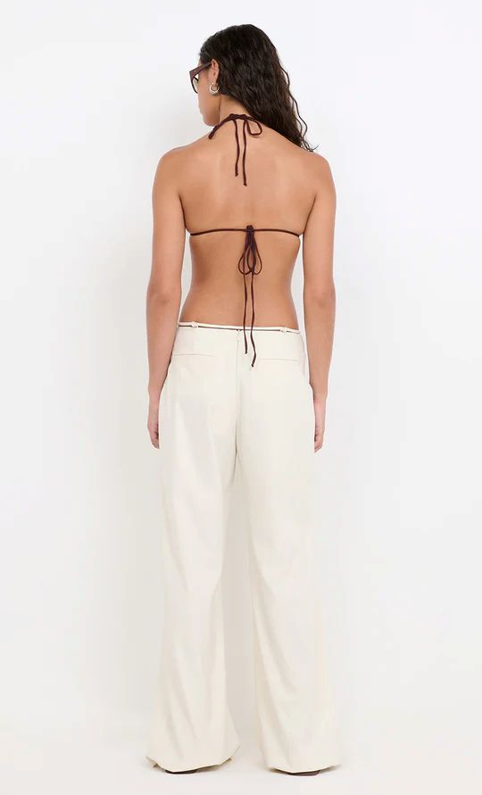 The Devyn Beaded Pant in Cream is a modern tailoring piece designed with a sleek low-rise waist and delicate beaded accents.