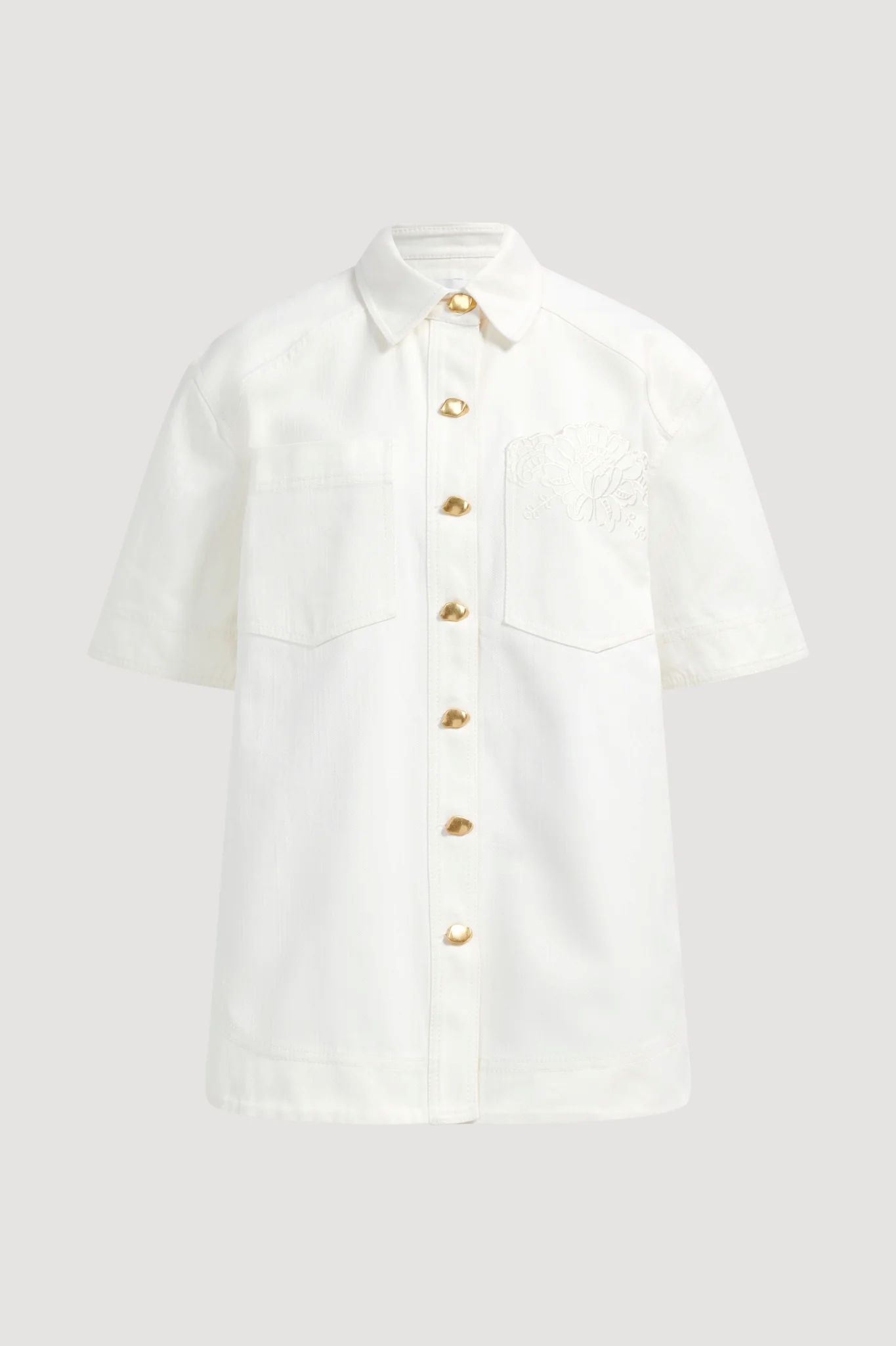 The Halo Embroidered Shirt in Ivory reimagines classic shirting with a relaxed silhouette and refined detailing.