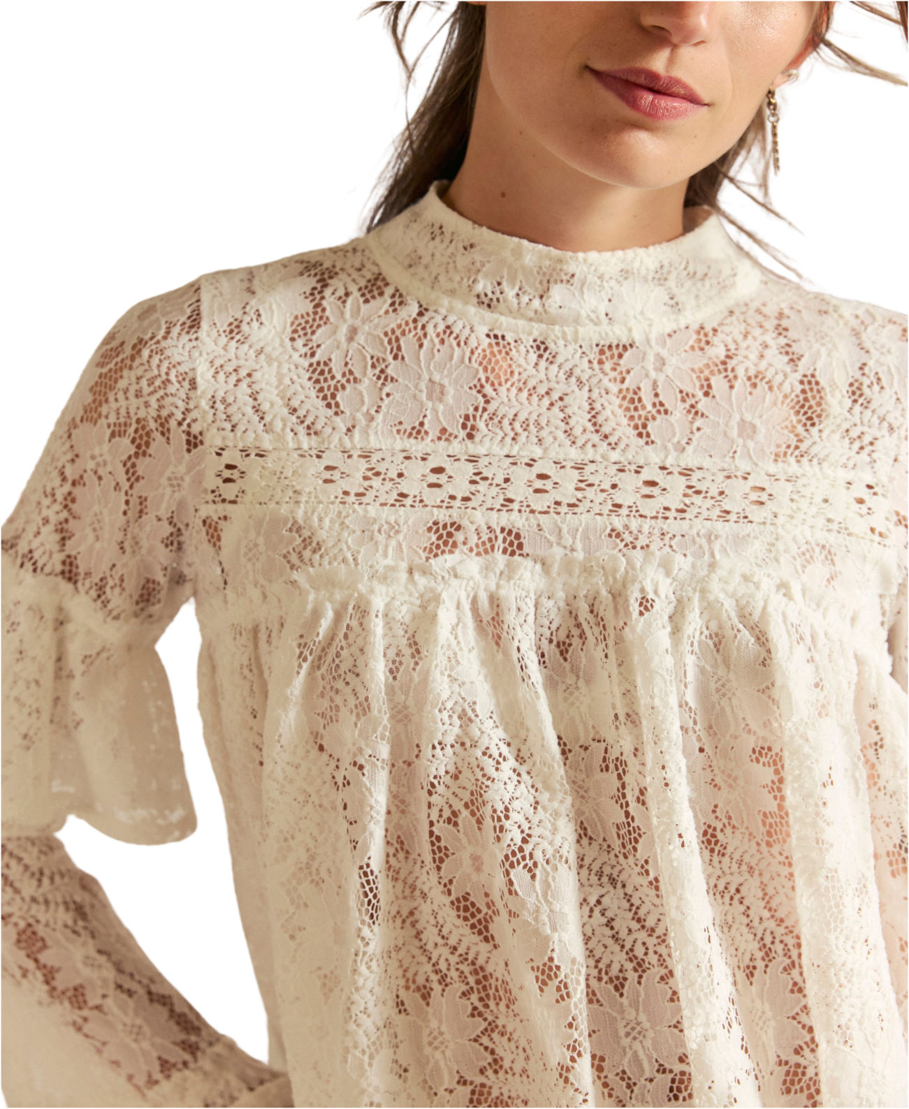 Designed with an all-over sheer lace finish, it features a soft mock neckline and delicate ruffle detailing that adds texture and movement.