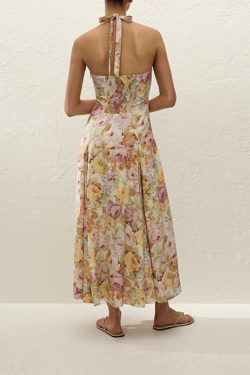 The Murano Midi Dress by Faithfull the Brand in Giardino Print brings a romantic feel to warm-weather dressing with its soft floral pattern and elegant halter silhouette.