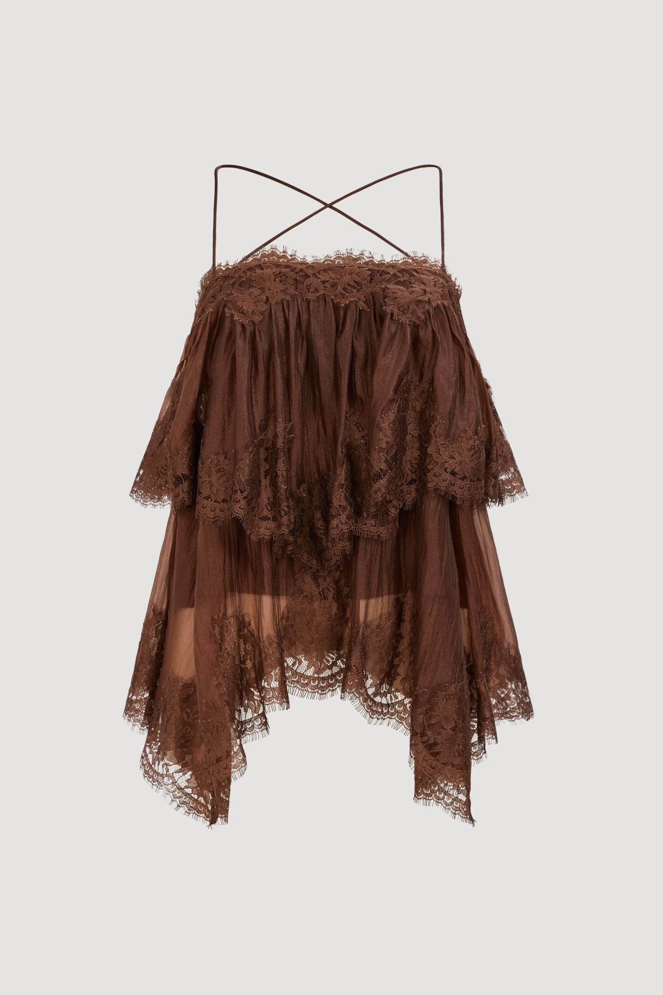 A layered hem with lace detailing adds soft texture and movement, making it a refined piece for both elevated daywear and occasion styling.