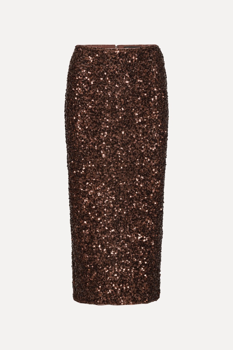 The Sequin Pencil Skirt in Dark Brown brings subtle drama to evening dressing.